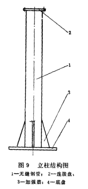 立柱用以支承平衡吊回轉(zhuǎn)部分及額定起吊零件的重量,所以要求有足夠的剛度。立柱的結(jié)構(gòu)一般選用大口徑無縫鋼管與連接盤、加強(qiáng)筋、底盤等零件焊接而成(圖9)。焊后要進(jìn)行退火處理。立柱的尺寸可參閱表2。