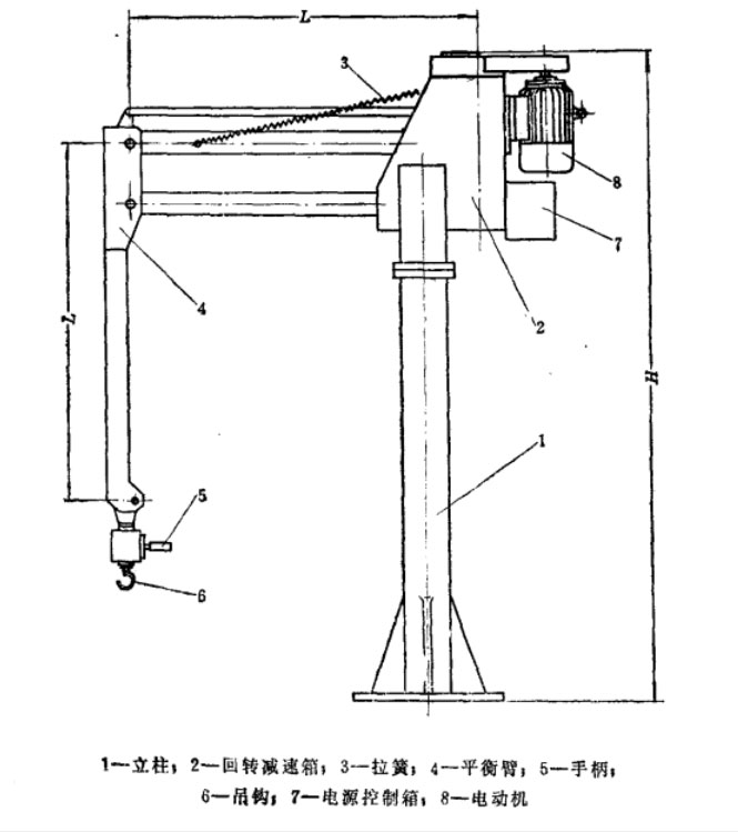 平衡吊主要由立柱1、回轉(zhuǎn)減速箱2、拉簧3、平衡臂4、手柄5、吊鉤6、電源控制箱7及電動機(jī)8等零部件組成,如圖所示。其外型尺寸參閱表1。